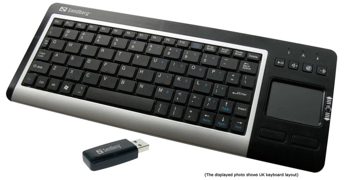 The Sandberg Mini Touchpad Keyboard combines a wireless keyboard and mouse in a single compact and handy device. The built-in, user-friendly touchpad takes on all mouse functions such as scroll and double-click. If your computer is connected to your TV, then you can sit back on the sofa and navigate your computer completely free of cables whether you’re surfing on the net, watching a film or doing something quite different. Insert the USB receiver provided into your computer and the keyboard is ready to use straight away without having to install any software.