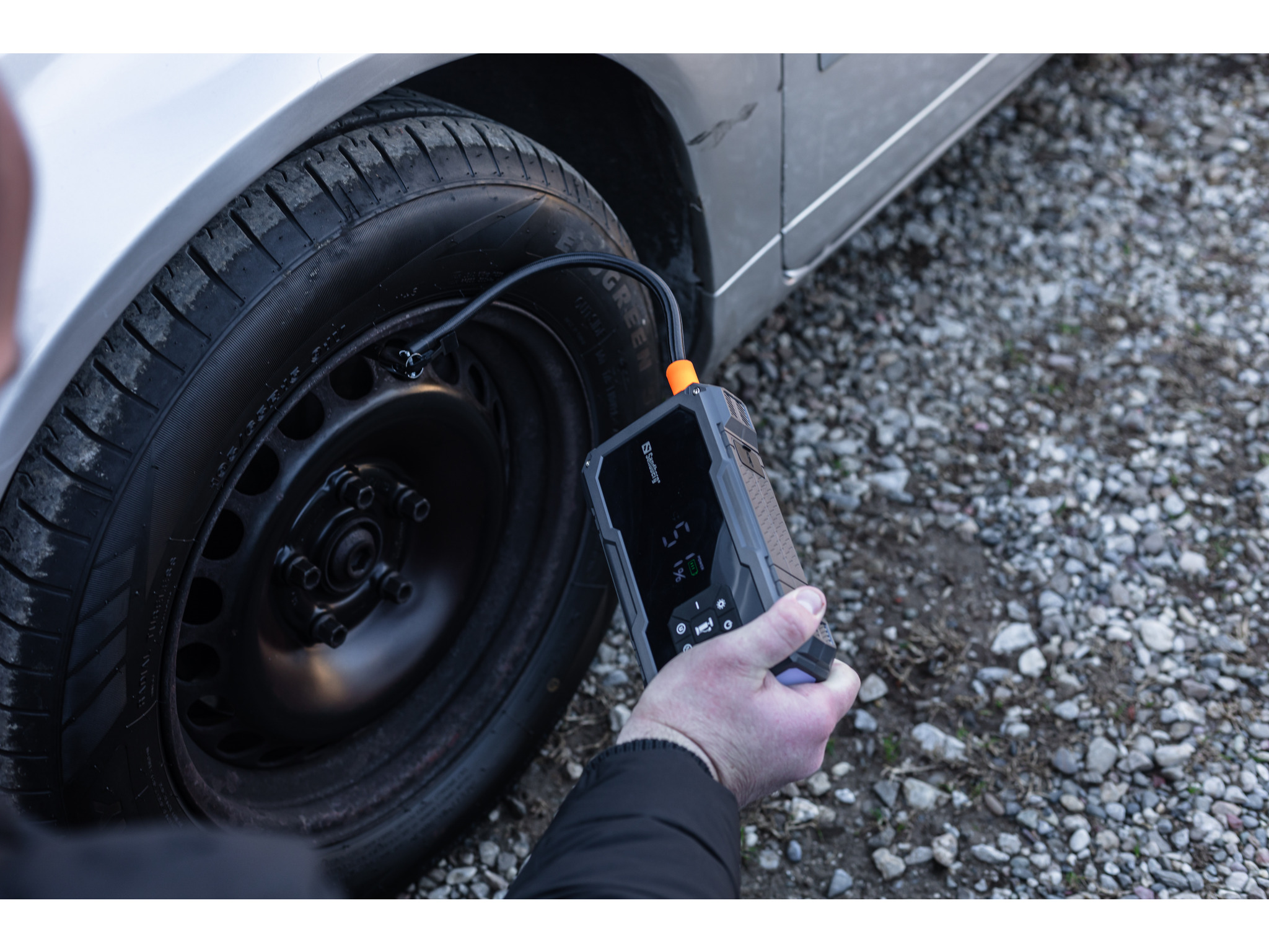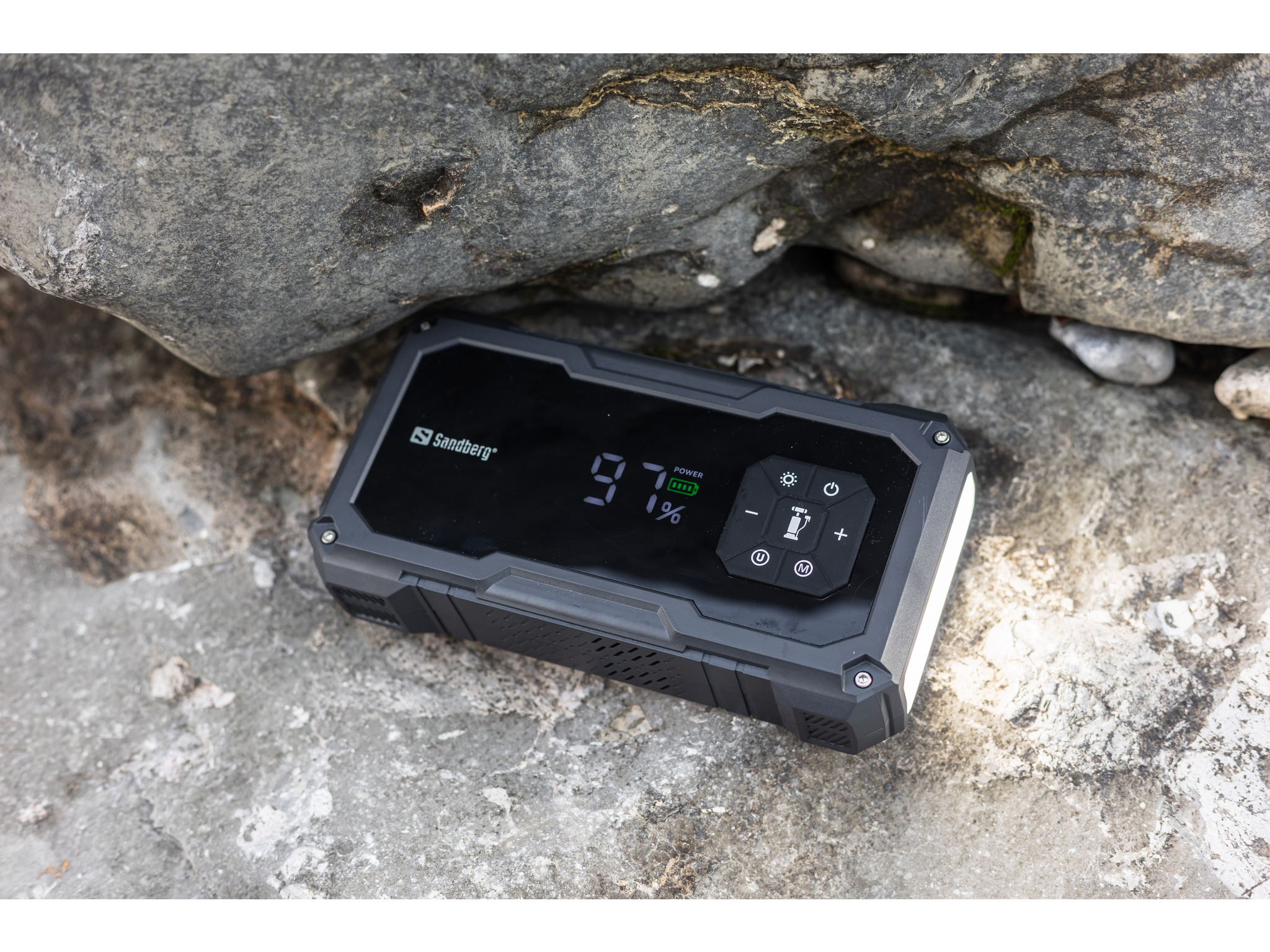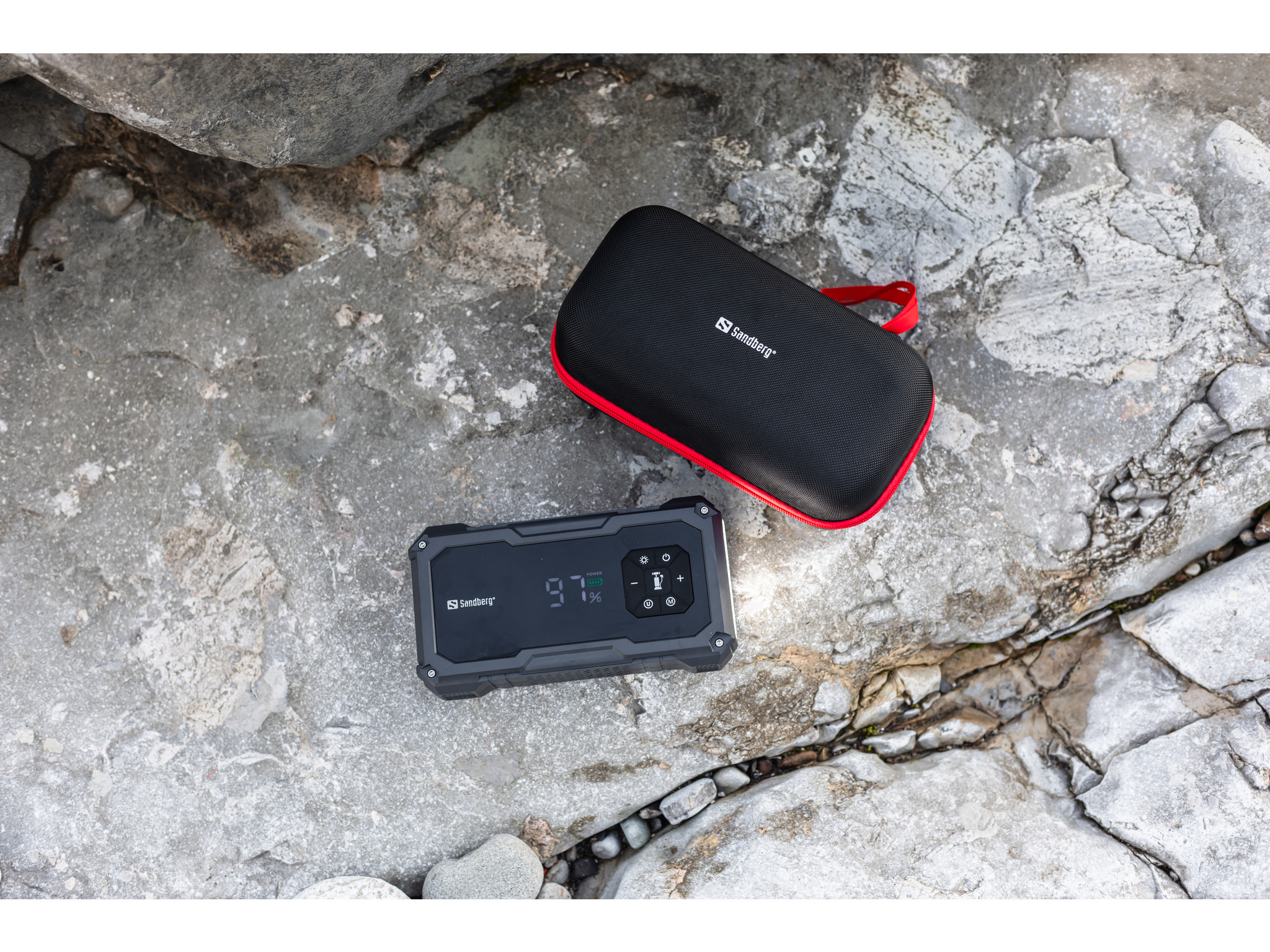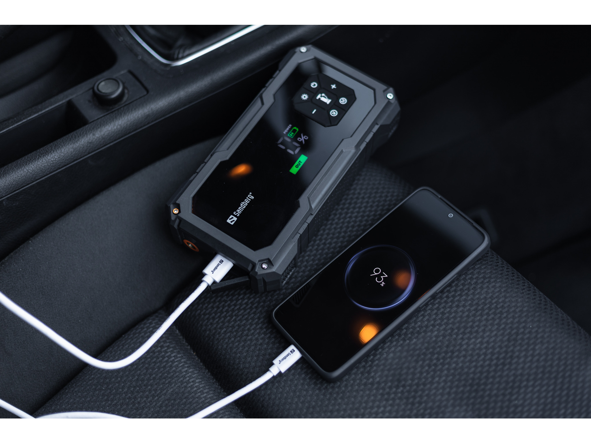 Sandberg Car Jumpstarter TirePump 10000 is your complete lifeline on the road. With a rugged design, you get a powerful jumpstarter, a 150 PSI air pump for things like bike and car tires, and a 10000 mAh powerbank for charging your USB devices. The built-in multifunctional LED flashlight ensures you can always see what you're doing. Perfect for the car, on the trip, or as part of your emergency kit.