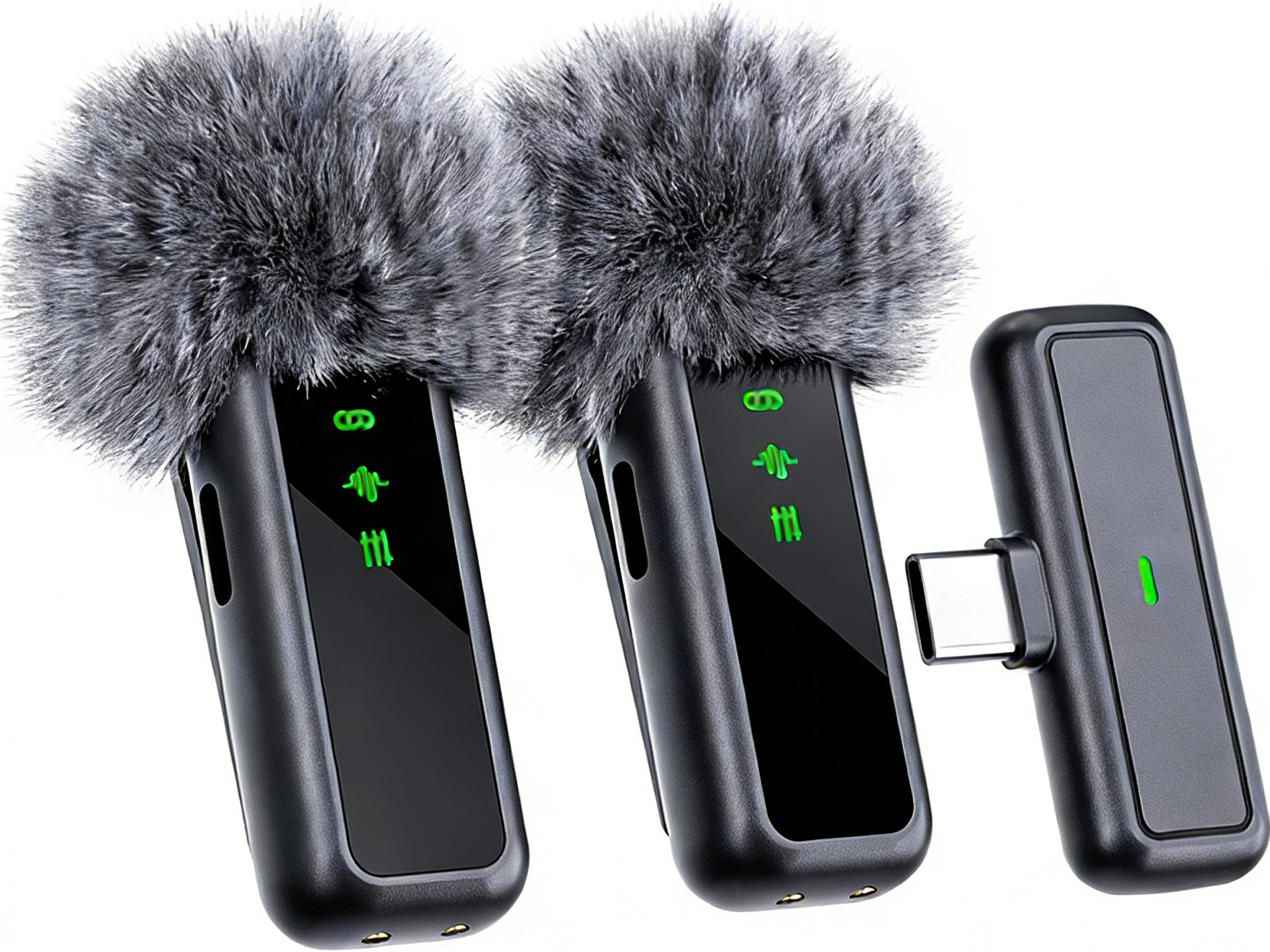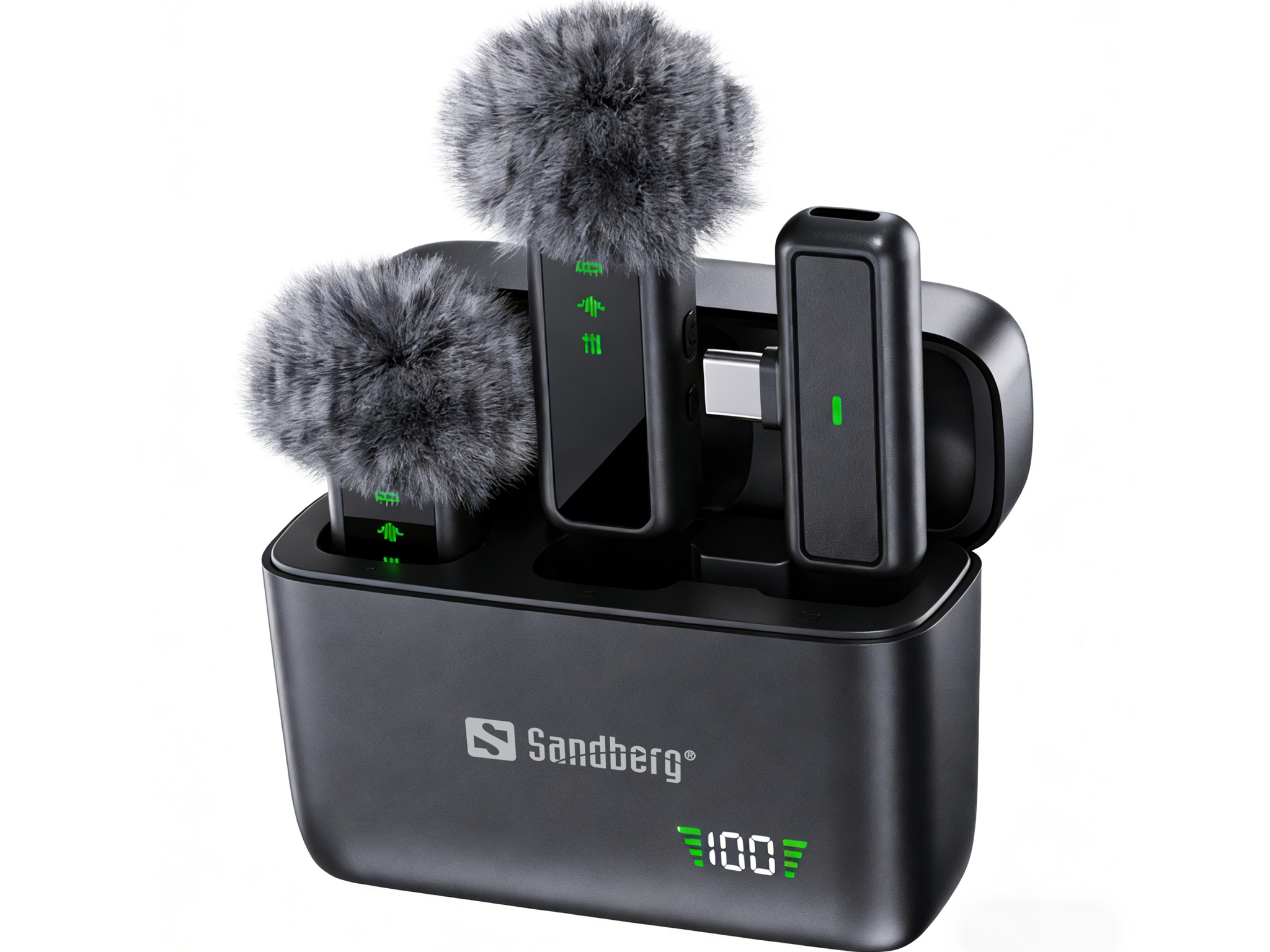 Sandberg Streamer USB-C Wireless Mic x2 is a compact wireless microphone set that makes it easy to record clear audio in seconds. Just plug the USB-C receiver into your smartphone, tablet, or computer, and you're ready to go—no cables, apps, or complicated setup needed. The set includes two wireless microphones, so you can use one alone for streaming and video or both simultaneously for interviews. The microphones are easily charged in the included charging case, making the set perfect for on-the-go use. Windshields are included to help reduce wind noise during outdoor recordings. Ideal for content creation, interviews, social media, and quick recordings with solid and clear sound.